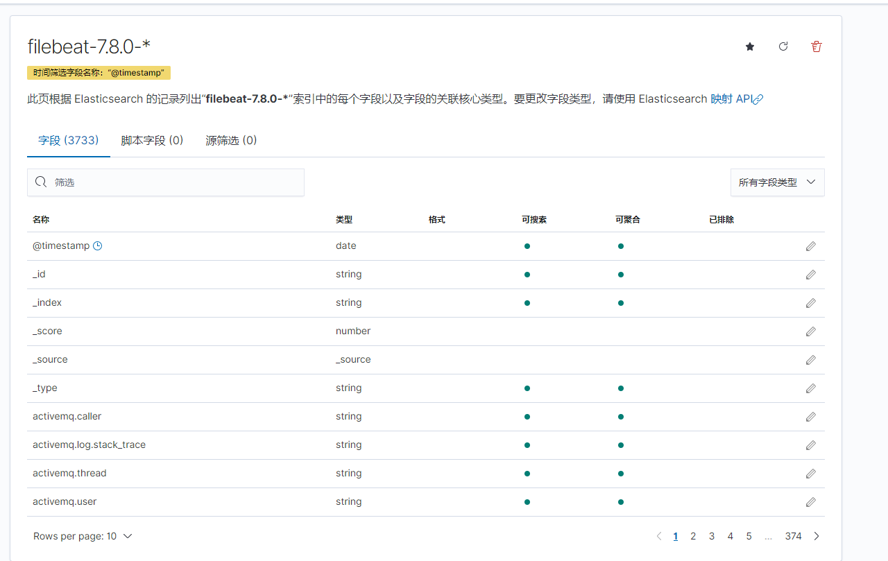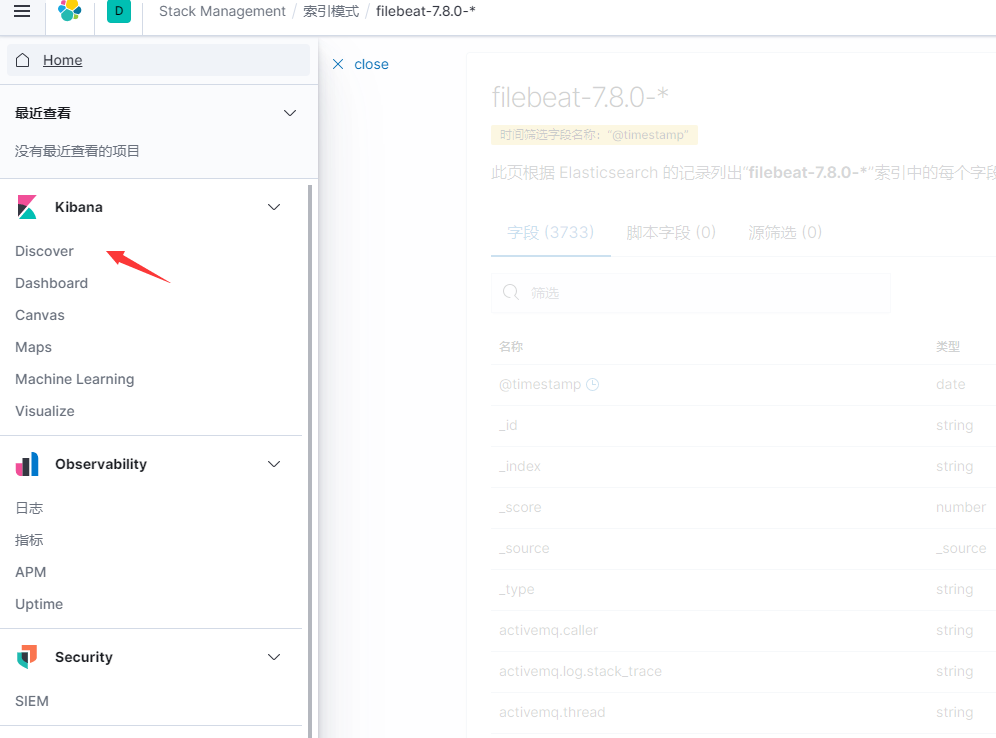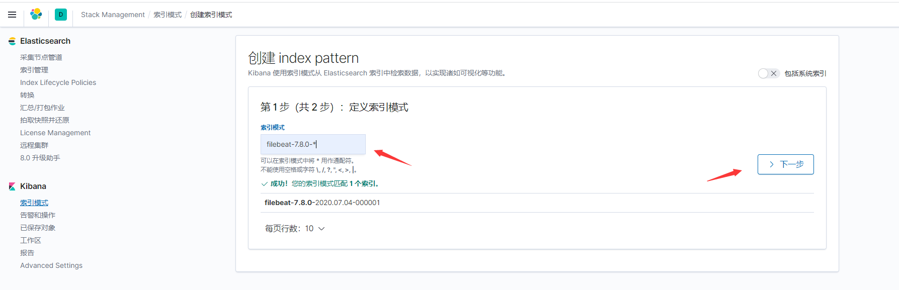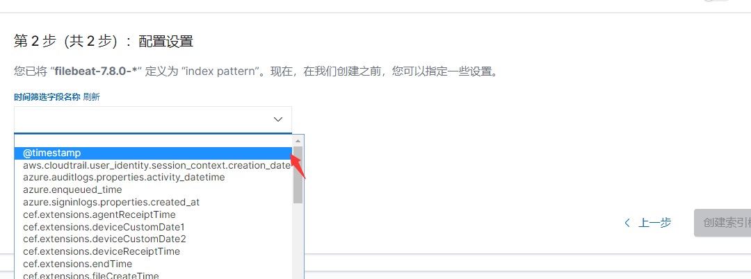 里面会有filebeat-版本号的索引 输入filebeat 然后点击next