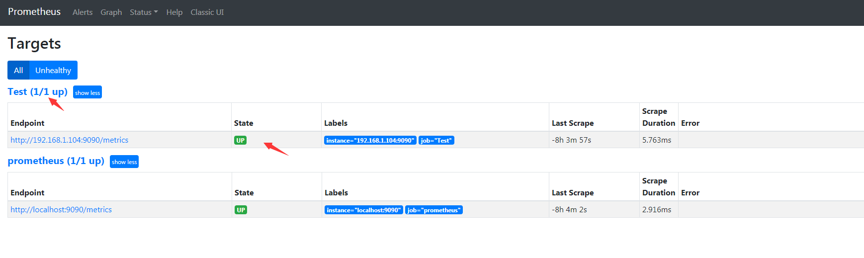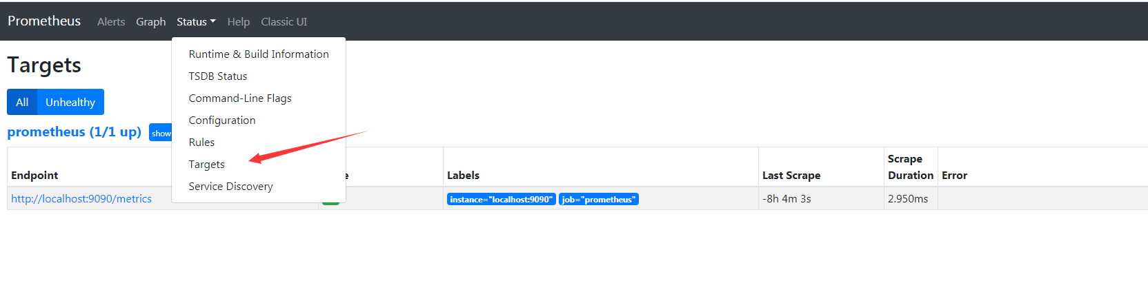 登录prometheus后台查看是否启动成功(默认端口9090)