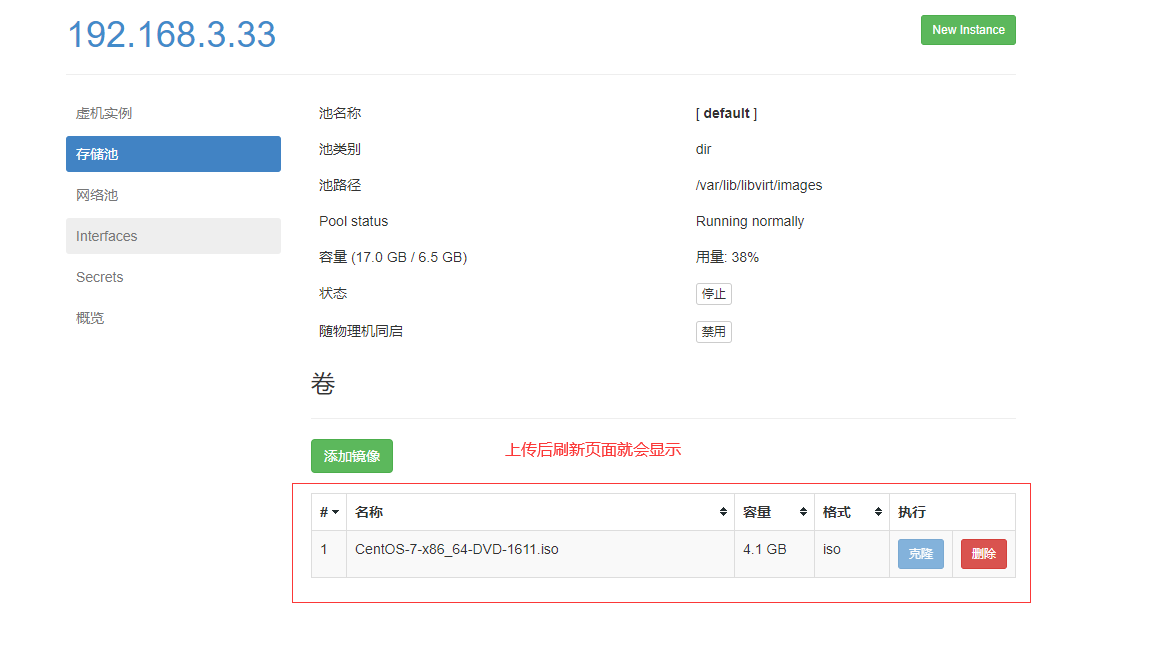 通过FTP或者SAMBA上传ISO镜像文件至存储目录/var/lib/libvirt/images/